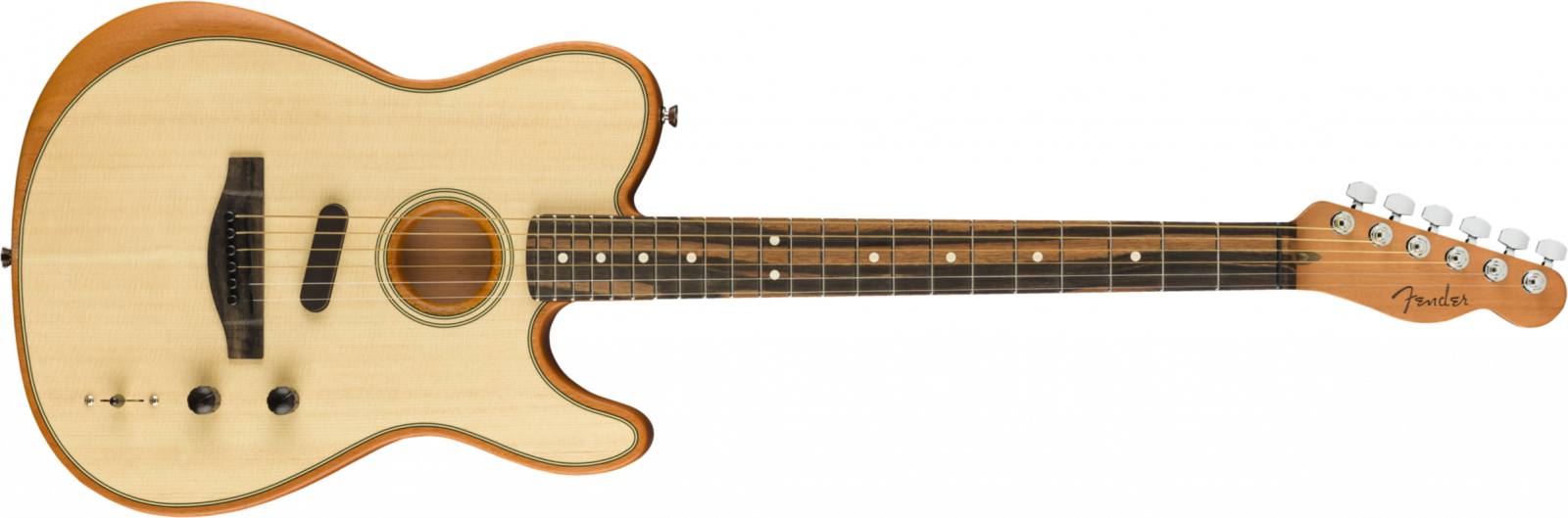 L’Acoustic Engine conçu par Fender et Fishman alimente l’Acoustasonic Telecaster et délivre une collection soigneusement sélectionnée de voix acoustiques et électriques. Construite entièrement en acajou, cette guitare puissante offre des aigus équilibrés, un médium focalisé et une réponse prononcée dans les graves, passant des transformations acoustiques aux timbres électriques rythmiques.