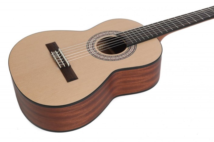 Le résultat est une guitare facile pour débuter, très bien équilibrée, avec une projection et une richesse harmoniques inhabituelles dans cette gamme de prix . Composée d’une table en épicéa, d’un fond et d’un manche en acajou et d’une touche en palissandre , elle délivre un son chaleureux et équilibré adapté à l’apprentissage. Elle est équipée de cordes SAVAREZ New Cristal Corum tension forte , garantissant une justesse et une durabilité optimales.