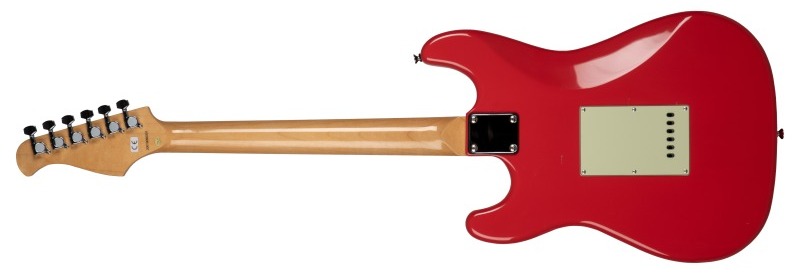 Equipée de trois micros simple bobinage Alnico V en configuration SSS, cette Fiesta Red s’adresse aux guitaristes débutants et intermédiaires recherchant un instrument polyvalent à tarif accessible. Le radius de 9,5″ (241 mm) et la largeur de sillet de 43 mm offrent un compromis ergonomique moderne.